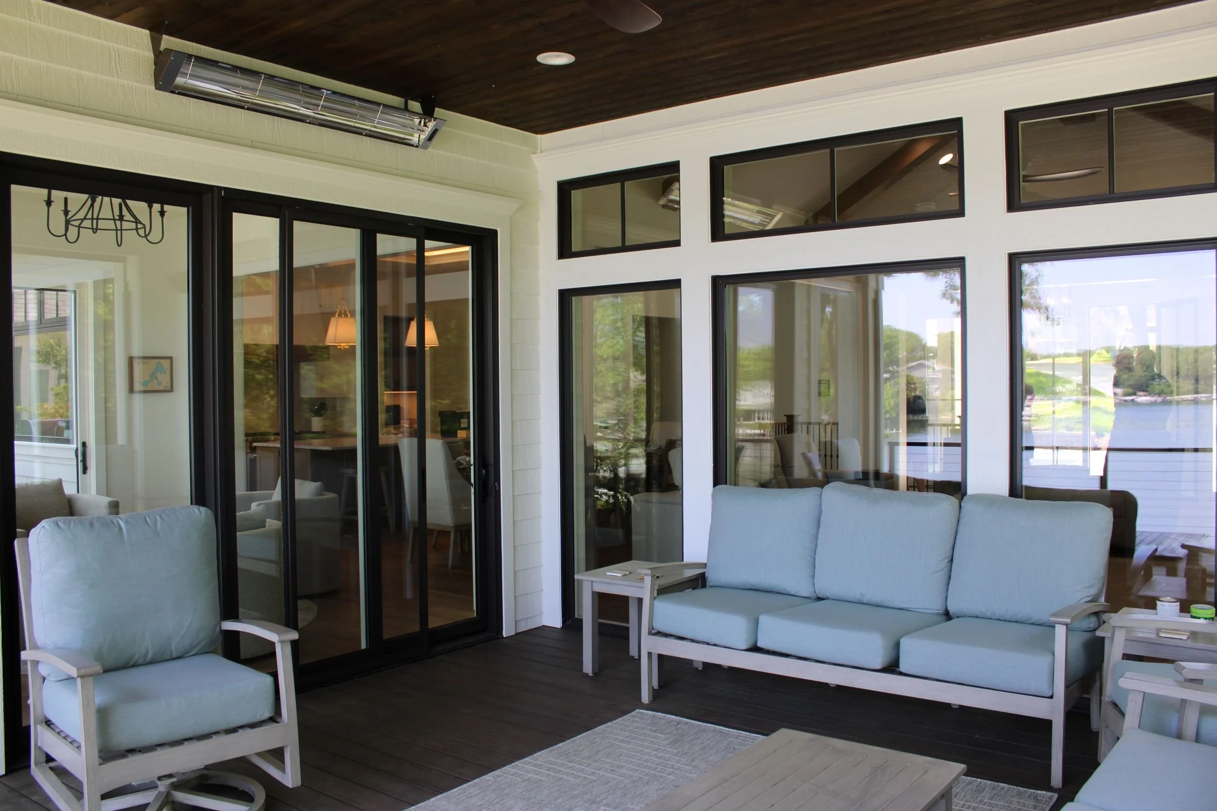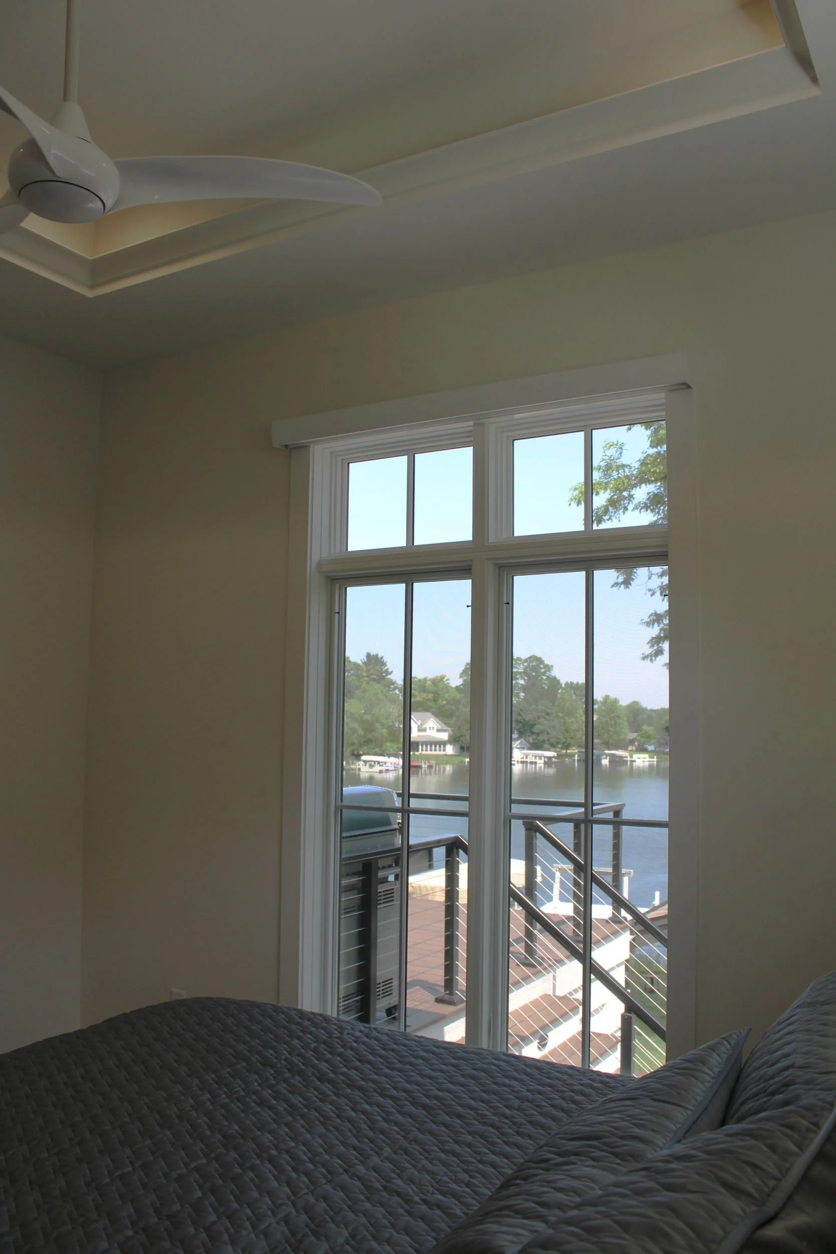 The rear of the home boasts a deck for grilling and sunning, plus dual covered patios on both levels with motorized retractable screens for when the mosquitoes come out.